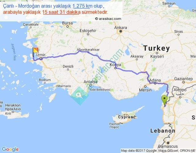Çanlı - Mordoğan arası yaklaşık olarak 90 km/h ile yukarıda belirtilen sürede olup, iki yerin kuş uçuşu uzaklığı (mesafesi) 886'dir. Eğer belirtilen yerler arasında uçak seferi var ise bu süre uçakla 1 saat 21 dakika'ya kadar düşebilir. Yolculuk otobüsle 20 saat 10 dakika sürmektedir.