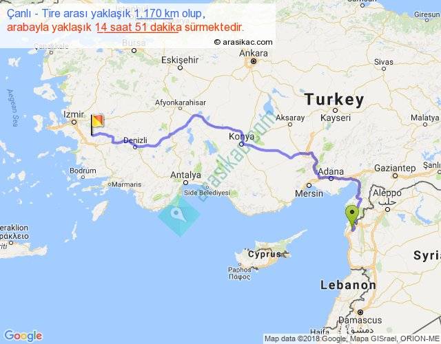 Çanlı - Tire arası yaklaşık olarak 90 km/h ile yukarıda belirtilen sürede olup, iki yerin kuş uçuşu uzaklığı (mesafesi) 778'dir. Eğer belirtilen yerler arasında uçak seferi var ise bu süre uçakla 1 saat 11 dakika'ya kadar düşebilir. Yolculuk otobüsle 19 saat 18 dakika sürmektedir.