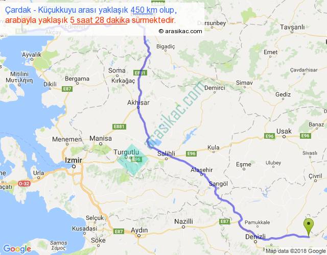 Çardak - Küçukkuyu arası yaklaşık olarak 90 km/h ile yukarıda belirtilen sürede olup, iki yerin kuş uçuşu uzaklığı (mesafesi) 327'dir. Eğer belirtilen yerler arasında uçak seferi var ise bu süre uçakla 30 dakika'ya kadar düşebilir. Yolculuk otobüsle 7 saat 6 dakika sürmektedir.