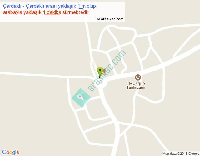 Çardaklı - Çardaklı arası yaklaşık olarak 90 km/h ile yukarıda belirtilen sürede olup, iki yerin kuş uçuşu uzaklığı (mesafesi) 0'dir. Yolculuk otobüsle 1 dakika sürmektedir.
