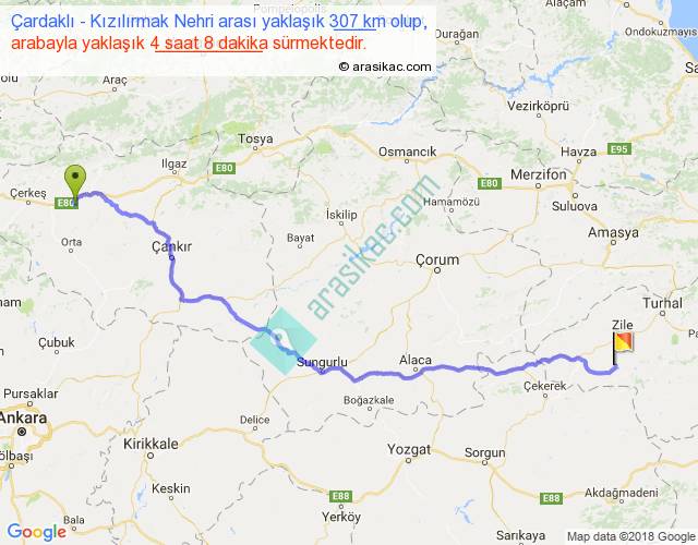 Çardaklı - Kızılırmak Nehri arası yaklaşık olarak 90 km/h ile yukarıda belirtilen sürede olup, iki yerin kuş uçuşu uzaklığı (mesafesi) 239'dir. Yolculuk otobüsle 5 saat 22 dakika sürmektedir.