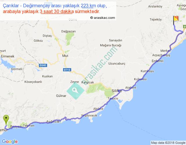Çarıklar - Değirmençay arası yaklaşık olarak 90 km/h ile yukarıda belirtilen sürede olup, iki yerin kuş uçuşu uzaklığı (mesafesi) 164'dir. Yolculuk otobüsle 4 saat 33 dakika sürmektedir.