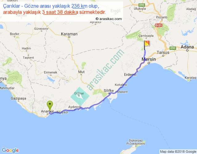 Çarıklar - Gözne arası yaklaşık olarak 90 km/h ile yukarıda belirtilen sürede olup, iki yerin kuş uçuşu uzaklığı (mesafesi) 179'dir. Yolculuk otobüsle 4 saat 43 dakika sürmektedir.