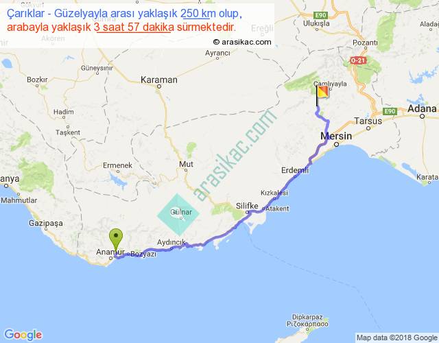 Çarıklar - Güzelyayla arası yaklaşık olarak 90 km/h ile yukarıda belirtilen sürede olup, iki yerin kuş uçuşu uzaklığı (mesafesi) 177'dir. Yolculuk otobüsle 5 saat 8 dakika sürmektedir.