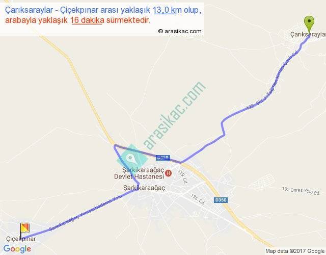 Çarıksaraylar - Çiçekpınar arası yaklaşık olarak 90 km/h ile yukarıda belirtilen sürede olup, iki yerin kuş uçuşu uzaklığı (mesafesi) 10'dir. Yolculuk otobüsle 20 dakika sürmektedir.