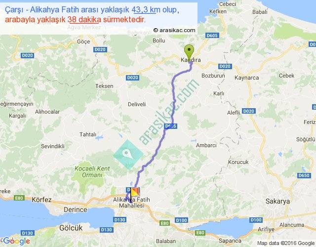 Çarşı - Alikahya Fatih arası yaklaşık olarak 90 km/h ile yukarıda belirtilen sürede olup, iki yerin kuş uçuşu uzaklığı (mesafesi) 35'dir. Yolculuk otobüsle 49 dakika sürmektedir.