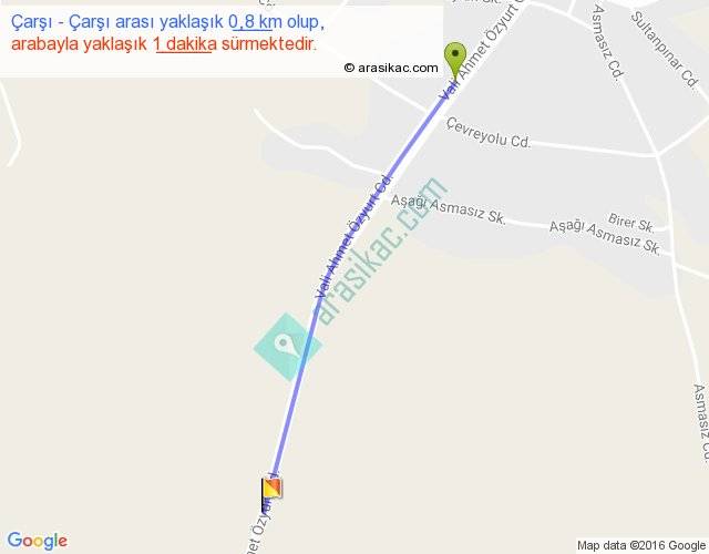 Çarşı - Çarşı arası yaklaşık olarak 90 km/h ile yukarıda belirtilen sürede olup, iki yerin kuş uçuşu uzaklığı (mesafesi) 1'dir. Yolculuk otobüsle 1 dakika sürmektedir.