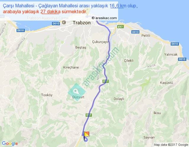 Çarşı Mahallesi - Çağlayan Mahallesi arası yaklaşık olarak 90 km/h ile yukarıda belirtilen sürede olup, iki yerin kuş uçuşu uzaklığı (mesafesi) 12'dir. Yolculuk otobüsle 35 dakika sürmektedir.