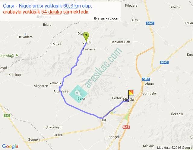 Çarşı - Niğde arası yaklaşık olarak 90 km/h ile yukarıda belirtilen sürede olup, iki yerin kuş uçuşu uzaklığı (mesafesi) 28'dir. Yolculuk otobüsle 1 saat 10 dakika sürmektedir.