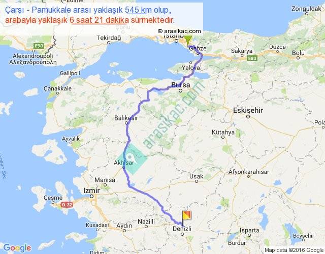 Çarşı - Pamukkale arası yaklaşık olarak 90 km/h ile yukarıda belirtilen sürede olup, iki yerin kuş uçuşu uzaklığı (mesafesi) 332'dir. Eğer belirtilen yerler arasında uçak seferi var ise bu süre uçakla 30 dakika'ya kadar düşebilir. Yolculuk otobüsle 8 saat 15 dakika sürmektedir.