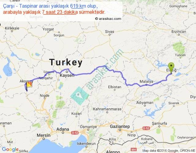 Çarşı - Taspinar arası yaklaşık olarak 90 km/h ile yukarıda belirtilen sürede olup, iki yerin kuş uçuşu uzaklığı (mesafesi) 452'dir. Eğer belirtilen yerler arasında uçak seferi var ise bu süre uçakla 41 dakika'ya kadar düşebilir. Yolculuk otobüsle 9 saat 35 dakika sürmektedir.