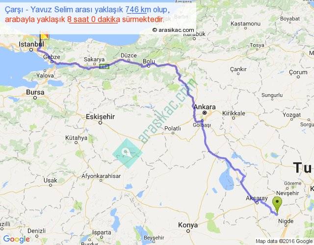 Çarşı - Yavuz Selim arası yaklaşık olarak 90 km/h ile yukarıda belirtilen sürede olup, iki yerin kuş uçuşu uzaklığı (mesafesi) 554'dir. Eğer belirtilen yerler arasında uçak seferi var ise bu süre uçakla 51 dakika'ya kadar düşebilir. Yolculuk otobüsle 10 saat 24 dakika sürmektedir.