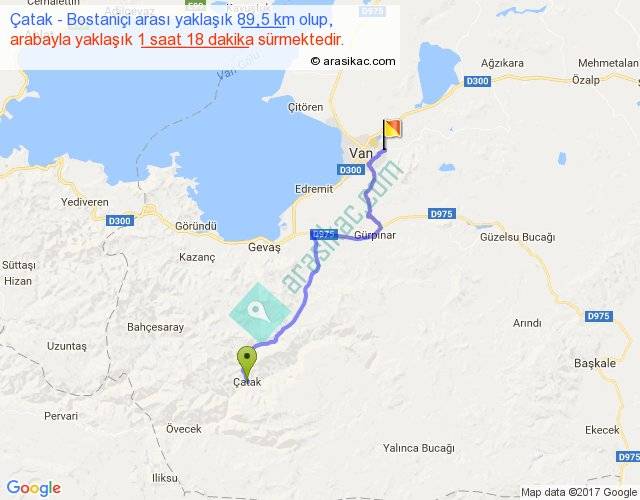 Çatak - Bostaniçi arası yaklaşık olarak 90 km/h ile yukarıda belirtilen sürede olup, iki yerin kuş uçuşu uzaklığı (mesafesi) 64'dir. Yolculuk otobüsle 1 saat 41 dakika sürmektedir.