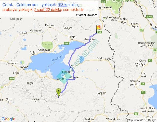 Çatak - Çaldıran arası yaklaşık olarak 90 km/h ile yukarıda belirtilen sürede olup, iki yerin kuş uçuşu uzaklığı (mesafesi) 146'dir. Yolculuk otobüsle 3 saat 4 dakika sürmektedir.