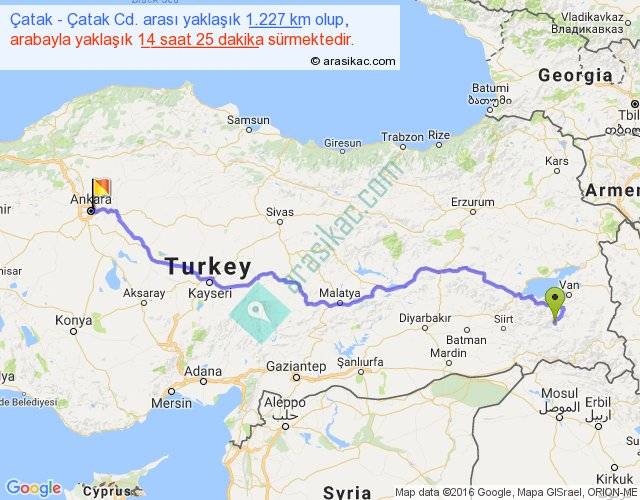Çatak - Çatak Cd. arası yaklaşık olarak 90 km/h ile yukarıda belirtilen sürede olup, iki yerin kuş uçuşu uzaklığı (mesafesi) 896'dir. Eğer belirtilen yerler arasında uçak seferi var ise bu süre uçakla 1 saat 22 dakika'ya kadar düşebilir. Yolculuk otobüsle 18 saat 44 dakika sürmektedir.