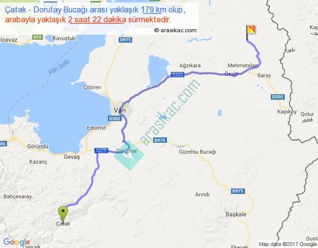 Çatak - Dorutay Bucağı arası yaklaşık olarak 90 km/h ile yukarıda belirtilen sürede olup, iki yerin kuş uçuşu uzaklığı (mesafesi) 124'dir. Yolculuk otobüsle 3 saat 4 dakika sürmektedir.