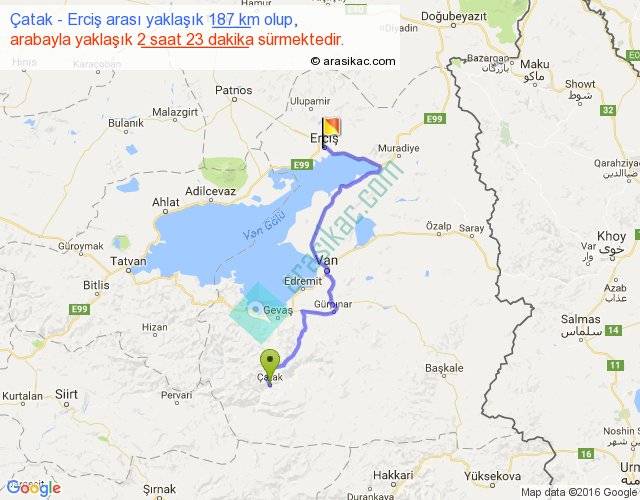 Çatak - Erciş arası yaklaşık olarak 90 km/h ile yukarıda belirtilen sürede olup, iki yerin kuş uçuşu uzaklığı (mesafesi) 116'dir. Yolculuk otobüsle 3 saat 5 dakika sürmektedir.