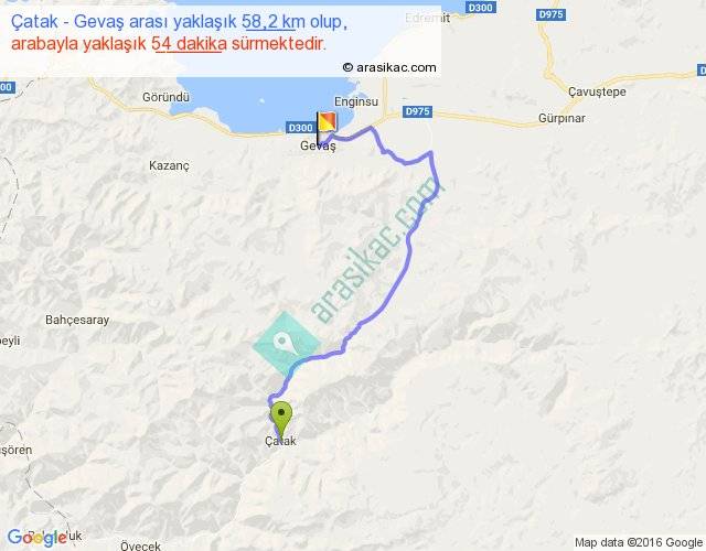 Çatak - Gevaş arası yaklaşık olarak 90 km/h ile yukarıda belirtilen sürede olup, iki yerin kuş uçuşu uzaklığı (mesafesi) 32'dir. Yolculuk otobüsle 1 saat 10 dakika sürmektedir.