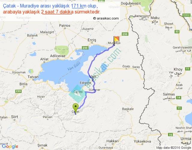 Çatak - Muradiye arası yaklaşık olarak 90 km/h ile yukarıda belirtilen sürede olup, iki yerin kuş uçuşu uzaklığı (mesafesi) 125'dir. Yolculuk otobüsle 2 saat 45 dakika sürmektedir.
