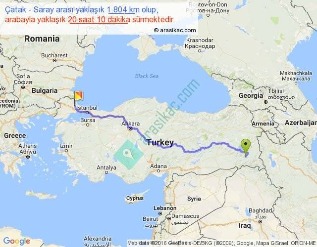 Çatak - Saray arası yaklaşık olarak 90 km/h ile yukarıda belirtilen sürede olup, iki yerin kuş uçuşu uzaklığı (mesafesi) 1340'dir. Eğer belirtilen yerler arasında uçak seferi var ise bu süre uçakla 2 saat 03 dakika'ya kadar düşebilir. Yolculuk otobüsle 1 gün 2 saat sürmektedir.