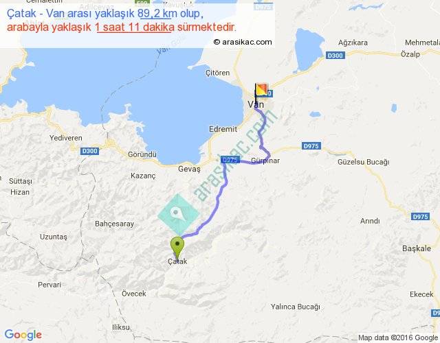 Çatak - Van arası yaklaşık olarak 90 km/h ile yukarıda belirtilen sürede olup, iki yerin kuş uçuşu uzaklığı (mesafesi) 61'dir. Yolculuk otobüsle 1 saat 32 dakika sürmektedir.
