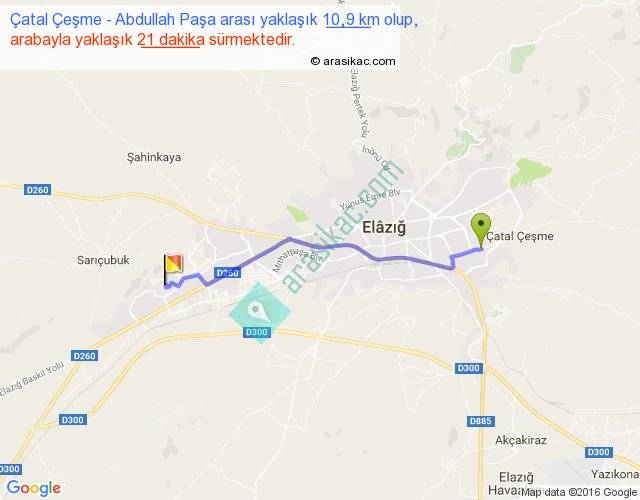 Çatal Çeşme - Abdullah Paşa arası yaklaşık olarak 90 km/h ile yukarıda belirtilen sürede olup, iki yerin kuş uçuşu uzaklığı (mesafesi) 9'dir. Yolculuk otobüsle 27 dakika sürmektedir.