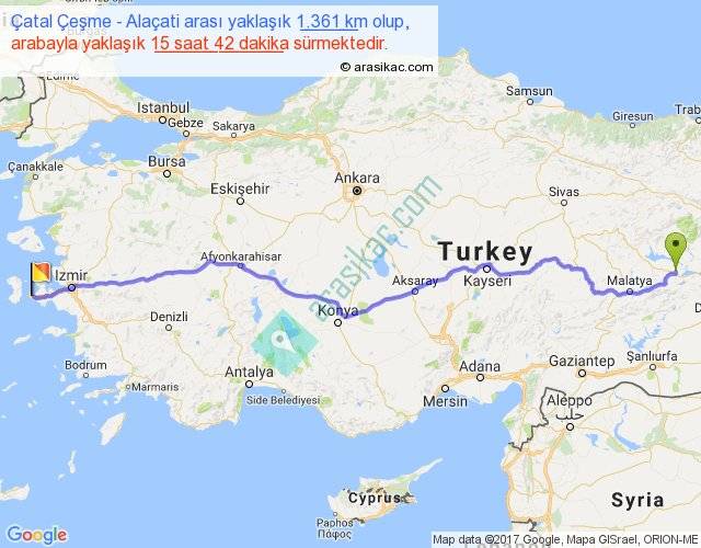 Çatal Çeşme - Alaçati arası yaklaşık olarak 90 km/h ile yukarıda belirtilen sürede olup, iki yerin kuş uçuşu uzaklığı (mesafesi) 1114'dir. Eğer belirtilen yerler arasında uçak seferi var ise bu süre uçakla 1 saat 42 dakika'ya kadar düşebilir. Yolculuk otobüsle 20 saat 24 dakika sürmektedir.