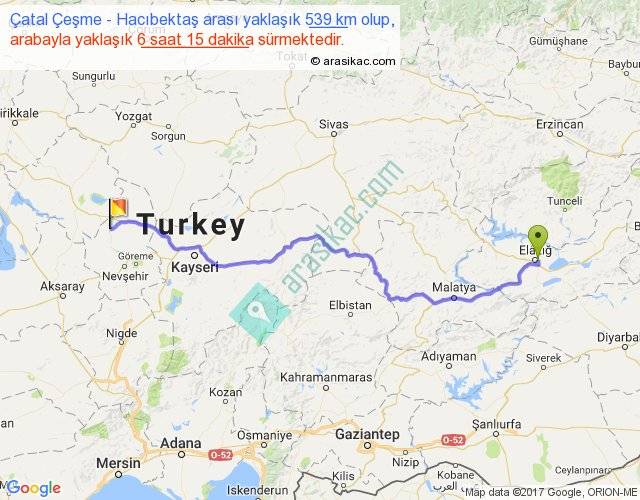 Çatal Çeşme - Hacıbektaş arası yaklaşık olarak 90 km/h ile yukarıda belirtilen sürede olup, iki yerin kuş uçuşu uzaklığı (mesafesi) 406'dir. Eğer belirtilen yerler arasında uçak seferi var ise bu süre uçakla 37 dakika'ya kadar düşebilir. Yolculuk otobüsle 8 saat 7 dakika sürmektedir.