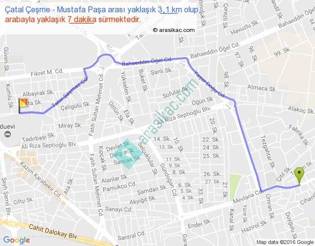 Çatal Çeşme - Mustafa Paşa arası yaklaşık olarak 90 km/h ile yukarıda belirtilen sürede olup, iki yerin kuş uçuşu uzaklığı (mesafesi) 2'dir. Yolculuk otobüsle 9 dakika sürmektedir.