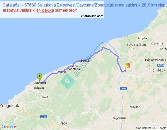 Çatalağzı - 67660 Saltukova Belediyesi Çaycuma Zonguldak arası yaklaşık olarak 90 km/h ile yukarıda belirtilen sürede olup, iki yerin kuş uçuşu uzaklığı (mesafesi) 19'dir. Yolculuk otobüsle 57 dakika sürmektedir.