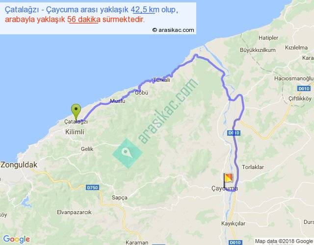 Çatalağzı - Çaycuma arası yaklaşık olarak 90 km/h ile yukarıda belirtilen sürede olup, iki yerin kuş uçuşu uzaklığı (mesafesi) 19'dir. Yolculuk otobüsle 1 saat 12 dakika sürmektedir.