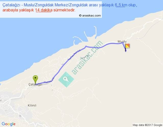 Çatalağzı - Muslu Zonguldak Merkez Zonguldak arası yaklaşık olarak 90 km/h ile yukarıda belirtilen sürede olup, iki yerin kuş uçuşu uzaklığı (mesafesi) 5'dir. Yolculuk otobüsle 18 dakika sürmektedir.