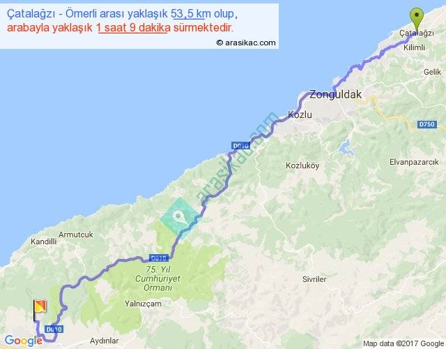 Çatalağzı - Ömerli arası yaklaşık olarak 90 km/h ile yukarıda belirtilen sürede olup, iki yerin kuş uçuşu uzaklığı (mesafesi) 39'dir. Yolculuk otobüsle 1 saat 29 dakika sürmektedir.