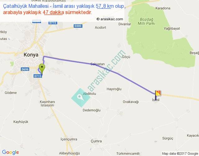 Çatalhüyük Mahallesi - İsmil arası yaklaşık olarak 90 km/h ile yukarıda belirtilen sürede olup, iki yerin kuş uçuşu uzaklığı (mesafesi) 45'dir. Yolculuk otobüsle 1 saat 1 dakika sürmektedir.