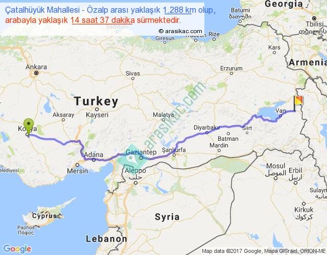 Çatalhüyük Mahallesi - Özalp arası yaklaşık olarak 90 km/h ile yukarıda belirtilen sürede olup, iki yerin kuş uçuşu uzaklığı (mesafesi) 999'dir. Eğer belirtilen yerler arasında uçak seferi var ise bu süre uçakla 1 saat 32 dakika'ya kadar düşebilir. Yolculuk otobüsle 19 saat 0 dakika sürmektedir.