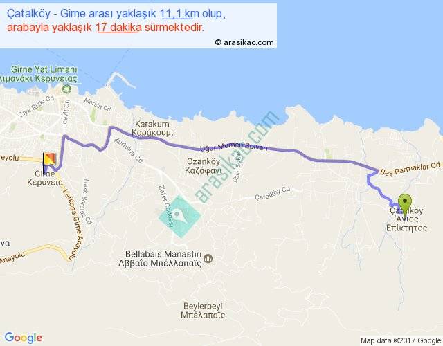 Çatalköy - Girne arası yaklaşık olarak 90 km/h ile yukarıda belirtilen sürede olup, iki yerin kuş uçuşu uzaklığı (mesafesi) 8'dir. Yolculuk otobüsle 22 dakika sürmektedir.