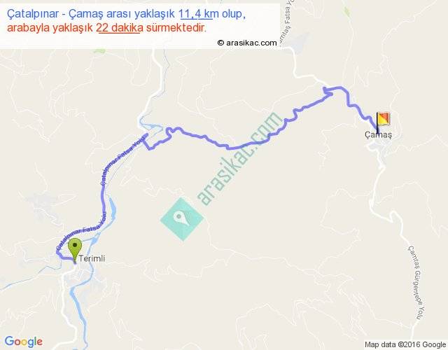 Çatalpınar - Çamaş arası yaklaşık olarak 90 km/h ile yukarıda belirtilen sürede olup, iki yerin kuş uçuşu uzaklığı (mesafesi) 7'dir. Yolculuk otobüsle 28 dakika sürmektedir.