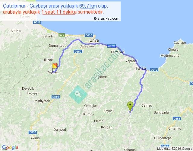 Çatalpınar - Çaybaşı arası yaklaşık olarak 90 km/h ile yukarıda belirtilen sürede olup, iki yerin kuş uçuşu uzaklığı (mesafesi) 33'dir. Yolculuk otobüsle 1 saat 32 dakika sürmektedir.