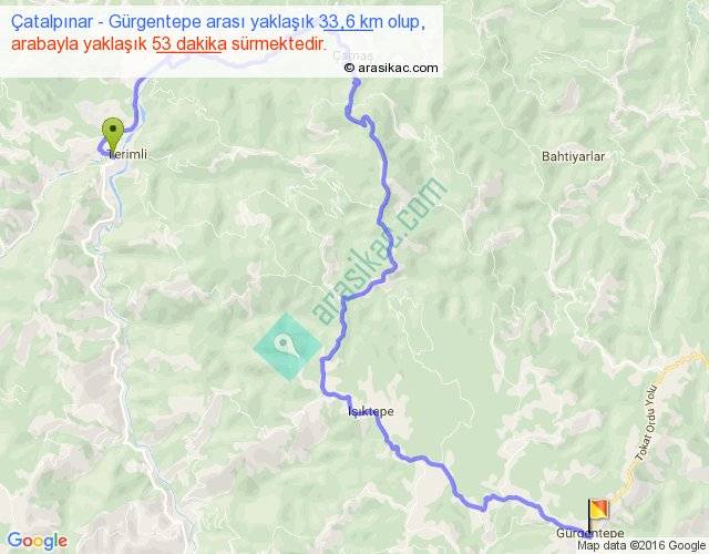 Çatalpınar - Gürgentepe arası yaklaşık olarak 90 km/h ile yukarıda belirtilen sürede olup, iki yerin kuş uçuşu uzaklığı (mesafesi) 16'dir. Yolculuk otobüsle 1 saat 8 dakika sürmektedir.