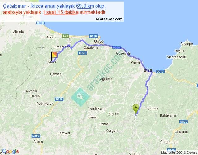 Çatalpınar - İkizce arası yaklaşık olarak 90 km/h ile yukarıda belirtilen sürede olup, iki yerin kuş uçuşu uzaklığı (mesafesi) 37'dir. Yolculuk otobüsle 1 saat 37 dakika sürmektedir.