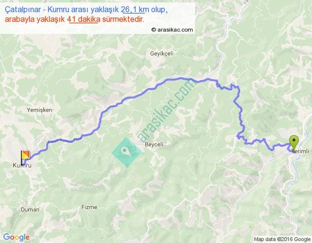Çatalpınar - Kumru arası yaklaşık olarak 90 km/h ile yukarıda belirtilen sürede olup, iki yerin kuş uçuşu uzaklığı (mesafesi) 16'dir. Yolculuk otobüsle 53 dakika sürmektedir.