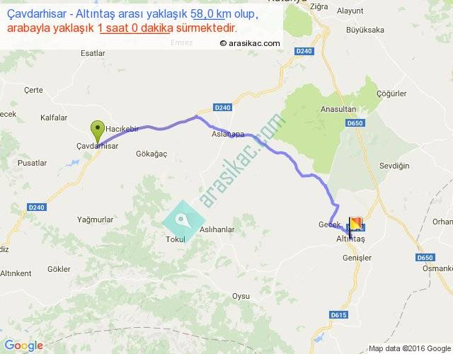 Çavdarhisar - Altıntaş arası yaklaşık olarak 90 km/h ile yukarıda belirtilen sürede olup, iki yerin kuş uçuşu uzaklığı (mesafesi) 45'dir. Yolculuk otobüsle 1 saat 18 dakika sürmektedir.