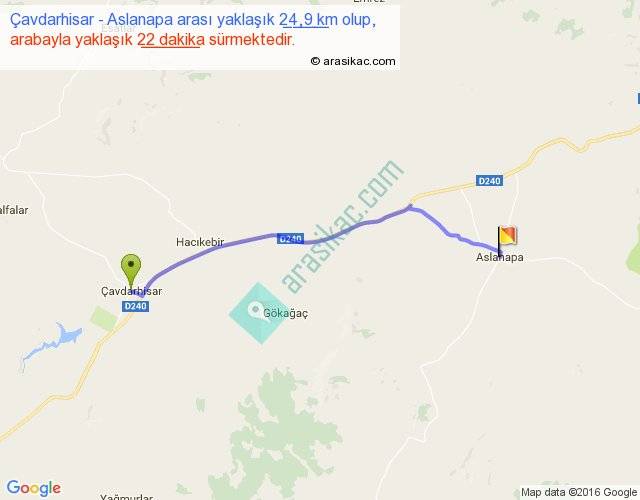 Çavdarhisar - Aslanapa arası yaklaşık olarak 90 km/h ile yukarıda belirtilen sürede olup, iki yerin kuş uçuşu uzaklığı (mesafesi) 22'dir. Yolculuk otobüsle 28 dakika sürmektedir.