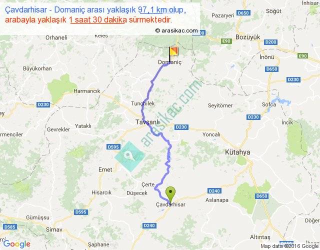 Çavdarhisar - Domaniç arası yaklaşık olarak 90 km/h ile yukarıda belirtilen sürede olup, iki yerin kuş uçuşu uzaklığı (mesafesi) 67'dir. Yolculuk otobüsle 1 saat 57 dakika sürmektedir.