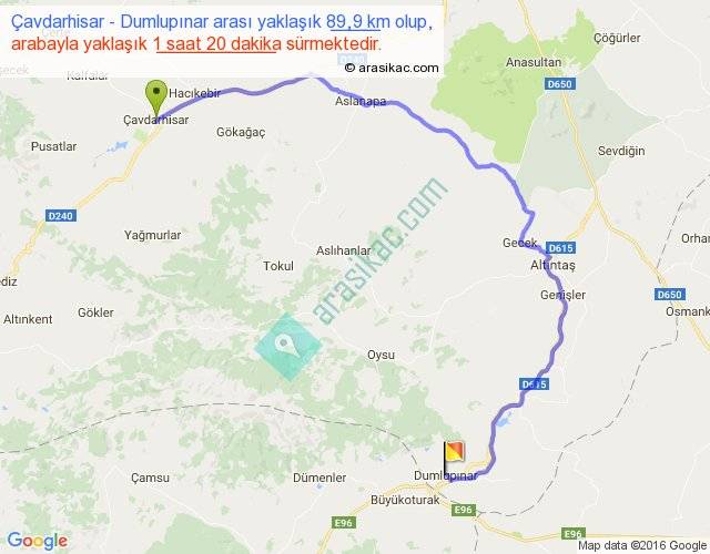 Çavdarhisar - Dumlupınar arası yaklaşık olarak 90 km/h ile yukarıda belirtilen sürede olup, iki yerin kuş uçuşu uzaklığı (mesafesi) 49'dir. Yolculuk otobüsle 1 saat 44 dakika sürmektedir.