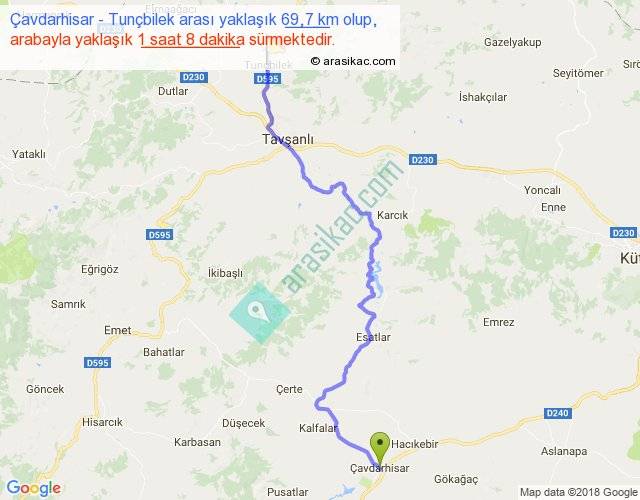 Çavdarhisar - Tunçbilek arası yaklaşık olarak 90 km/h ile yukarıda belirtilen sürede olup, iki yerin kuş uçuşu uzaklığı (mesafesi) 49'dir. Yolculuk otobüsle 1 saat 28 dakika sürmektedir.