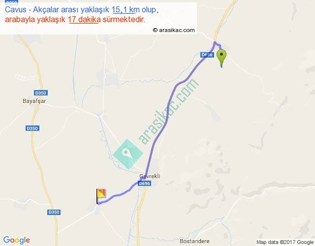 Cavus - Akçalar arası yaklaşık olarak 90 km/h ile yukarıda belirtilen sürede olup, iki yerin kuş uçuşu uzaklığı (mesafesi) 11'dir. Yolculuk otobüsle 22 dakika sürmektedir.