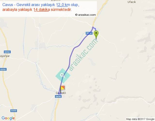 Cavus - Gevrekli arası yaklaşık olarak 90 km/h ile yukarıda belirtilen sürede olup, iki yerin kuş uçuşu uzaklığı (mesafesi) 8'dir. Yolculuk otobüsle 18 dakika sürmektedir.