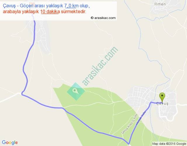 Çavuş - Göçeri arası yaklaşık olarak 90 km/h ile yukarıda belirtilen sürede olup, iki yerin kuş uçuşu uzaklığı (mesafesi) 4'dir. Yolculuk otobüsle 13 dakika sürmektedir.
