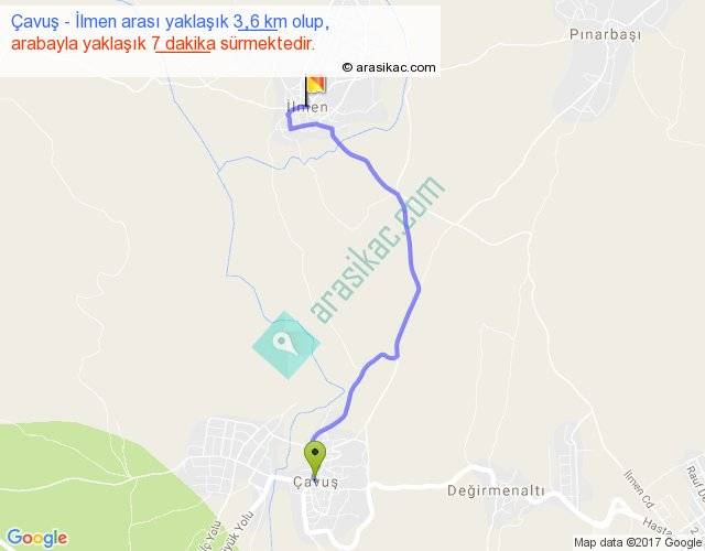 Çavuş - İlmen arası yaklaşık olarak 90 km/h ile yukarıda belirtilen sürede olup, iki yerin kuş uçuşu uzaklığı (mesafesi) 3'dir. Yolculuk otobüsle 9 dakika sürmektedir.